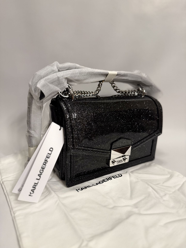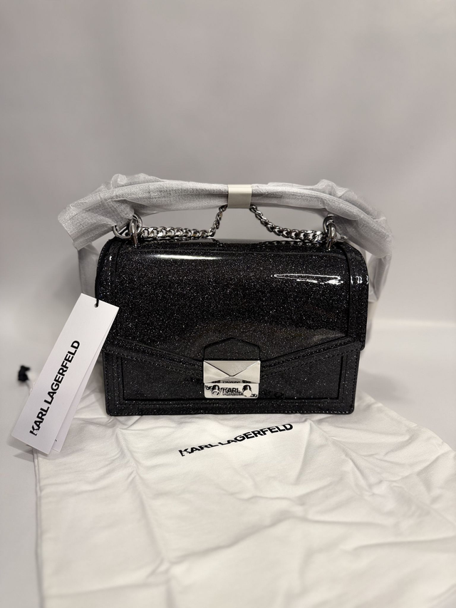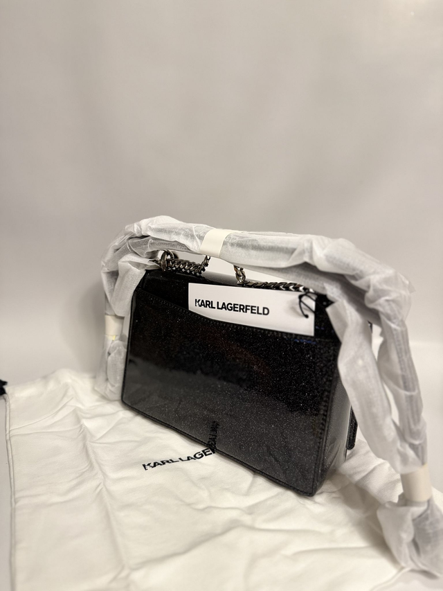 Дамска чанта KARL LAGERFELD, изработена от еко лак. Моделът е тип куфарче с елегантен и блестящ дизайн, който съчетава стил и практичност за ежедневна употреба или специални поводи.